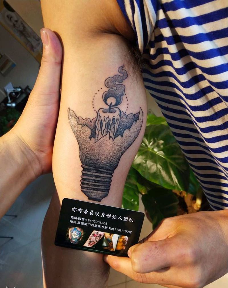 当前位置: 首页 >河北省邯郸市纹身店-帝易纹身总师父店纹身图案>灯纹身图片_手臂欧美写实New School纹身图案