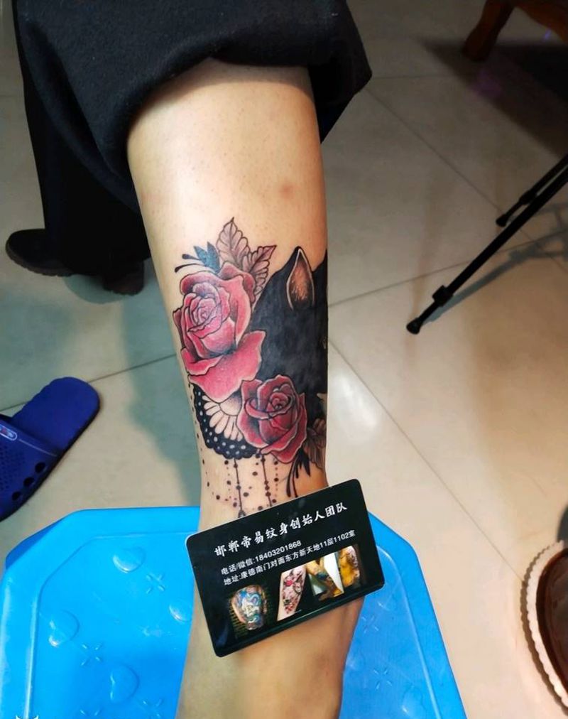 黑猫纹身图片_腿部New School水墨花纹身图案