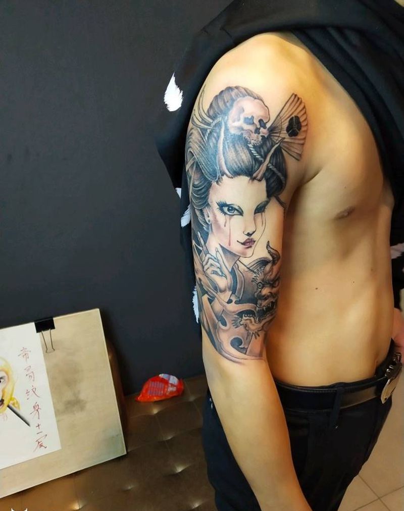 当前位置: 首页 >河北省邯郸市纹身店-帝易纹身总师父店纹身图案>鬼艺妓纹身图片_肩部手臂新传统艺妓纹身图案
