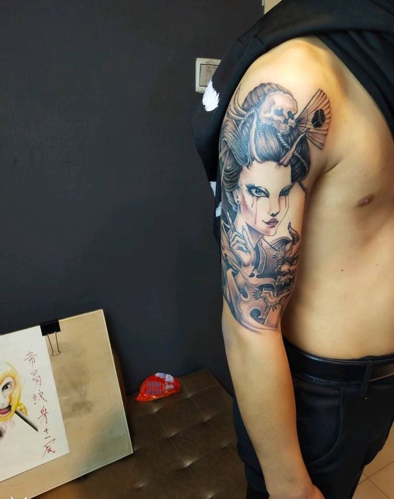当前位置: 首页 >河北省邯郸市纹身店-帝易纹身总师父店纹身图案>鬼艺妓纹身图片_肩部手臂新传统艺妓纹身图案