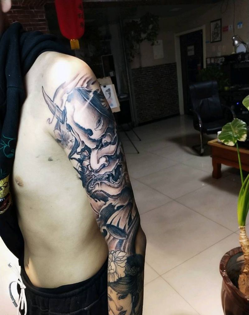 徒弟学习一个半月特价花臂纹身图片_手臂新传统花臂般若艺妓纹身图案