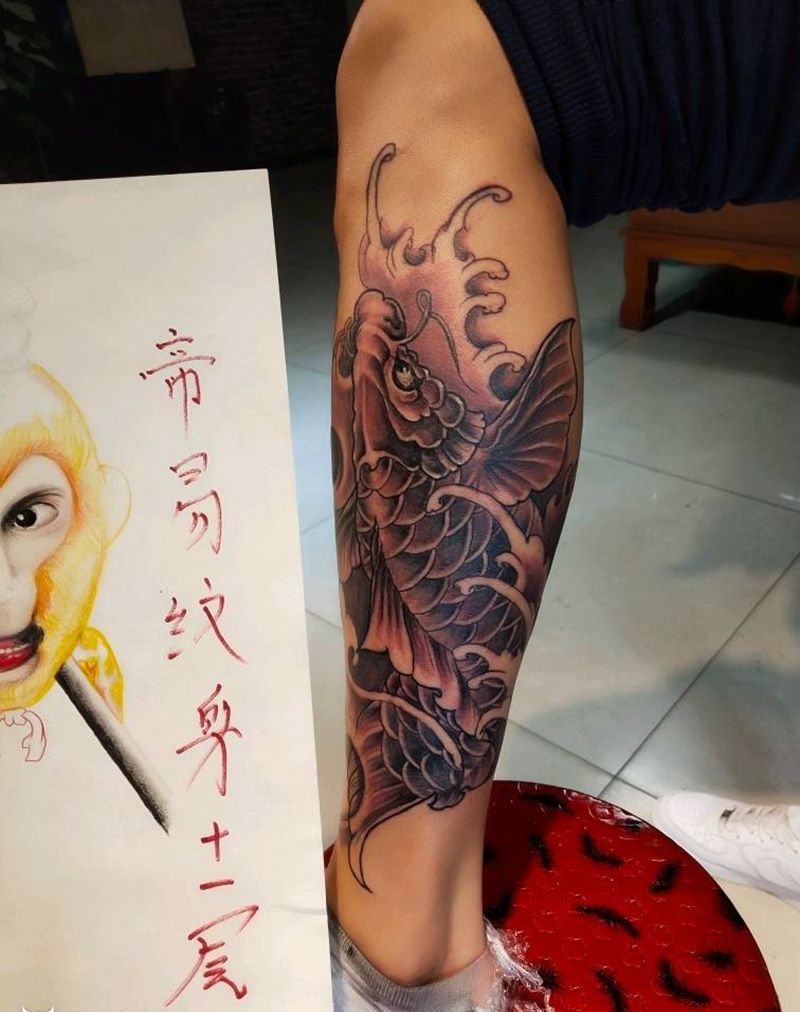 徒弟们做的大鲤鱼纹身图片_腿部新传统纹身图案