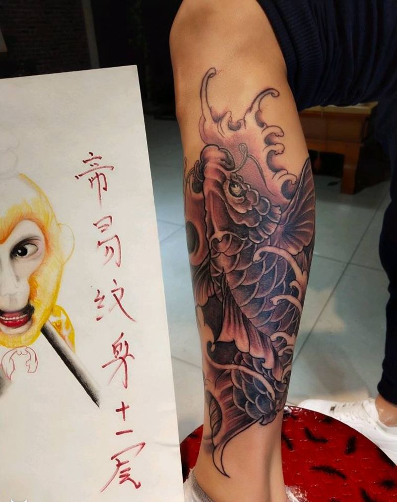 徒弟们做的大鲤鱼纹身图片_腿部新传统纹身图案