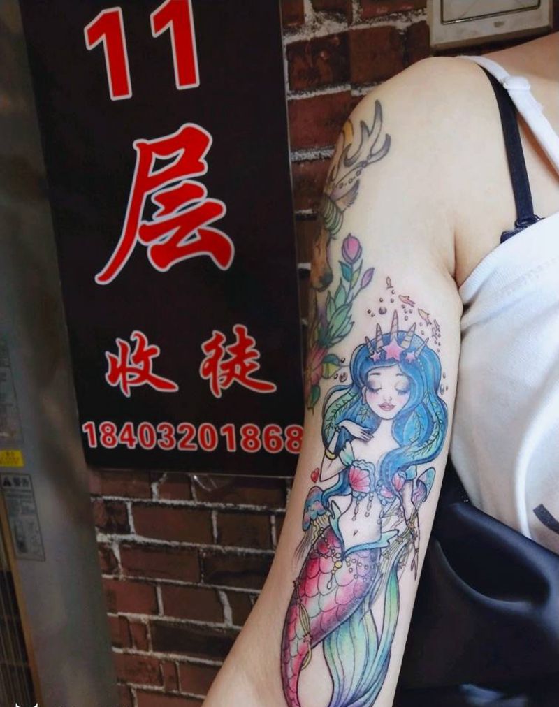 当前位置: 首页 >河北省邯郸市纹身店-帝易纹身总师父店纹身图案>卡通美人鱼纹身图片_手臂New School美人鱼纹身图案