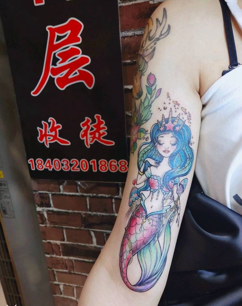 当前位置: 首页 >河北省邯郸市纹身店-帝易纹身总师父店纹身图案>卡通美人鱼纹身图片_手臂New School美人鱼纹身图案