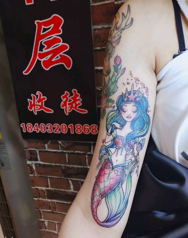 当前位置: 首页 >河北省邯郸市纹身店-帝易纹身总师父店纹身图案>卡通美人鱼纹身图片_手臂New School美人鱼纹身图案
