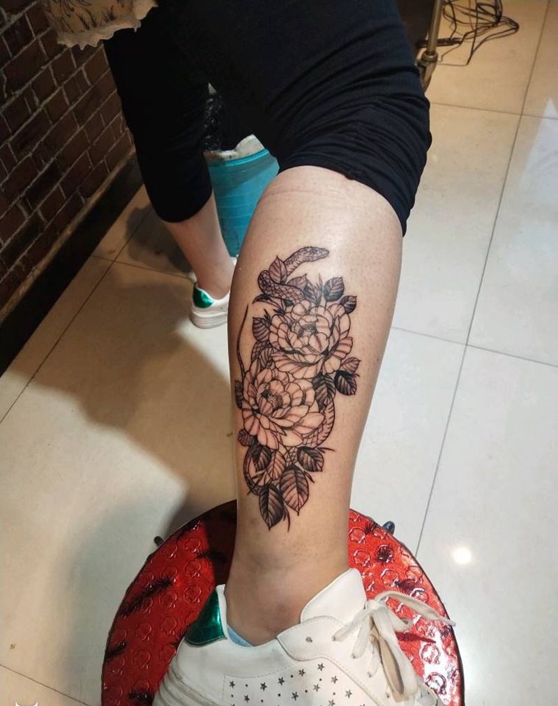 素花蛇缠牡丹纹身图片_脚部点刺素花纹身图案