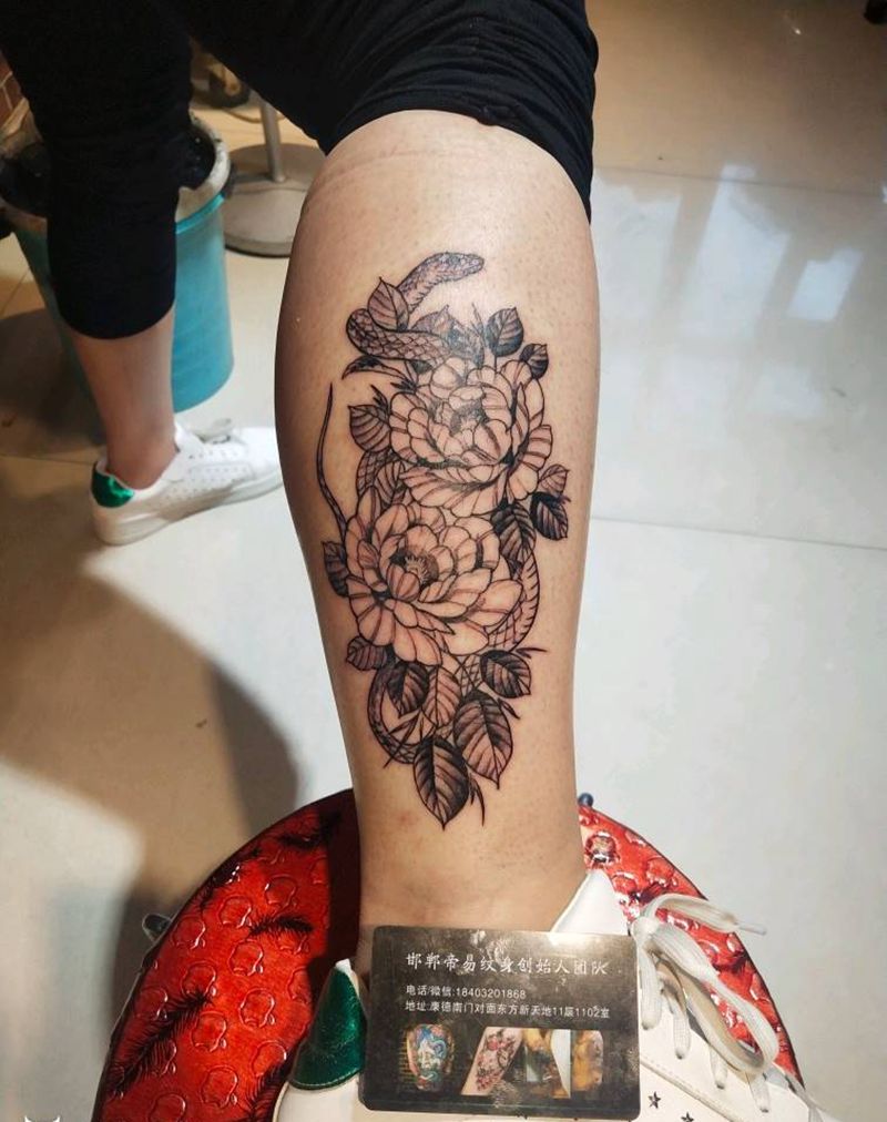 素花蛇缠牡丹纹身图片_脚部点刺素花纹身图案