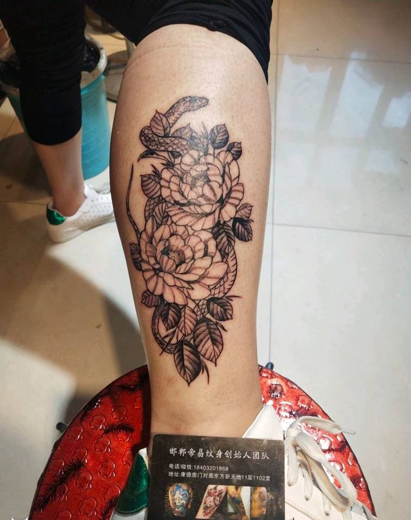 素花蛇缠牡丹纹身图片_脚部点刺素花纹身图案