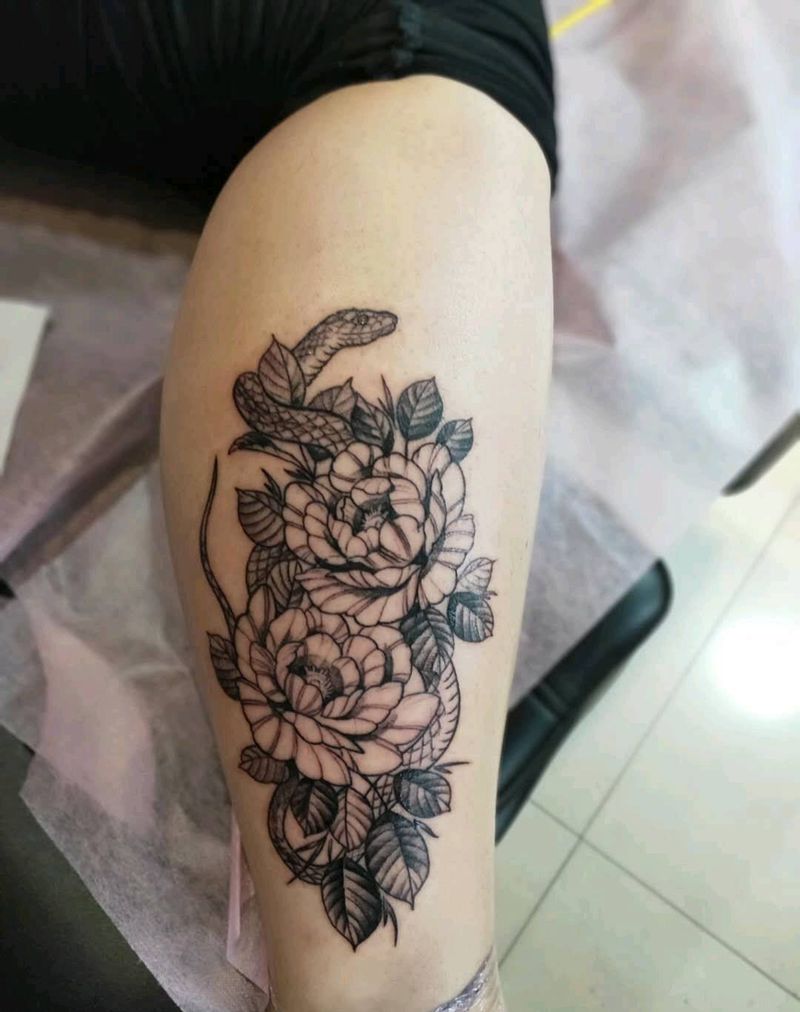 素花蛇缠牡丹纹身图片_脚部点刺素花纹身图案