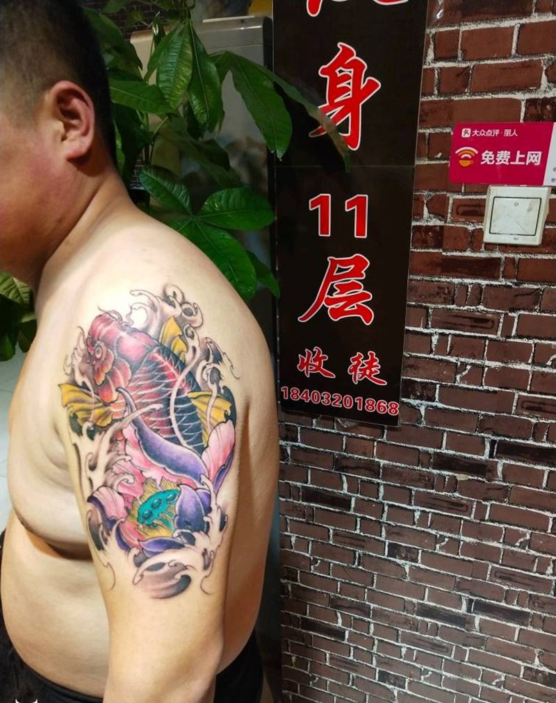 当前位置: 首页 >河北省邯郸市纹身店-帝易纹身总师父店纹身图案>两个徒弟合作完成大臂彩色鲤鱼纹身图片_肩部手臂新传统纹身图案