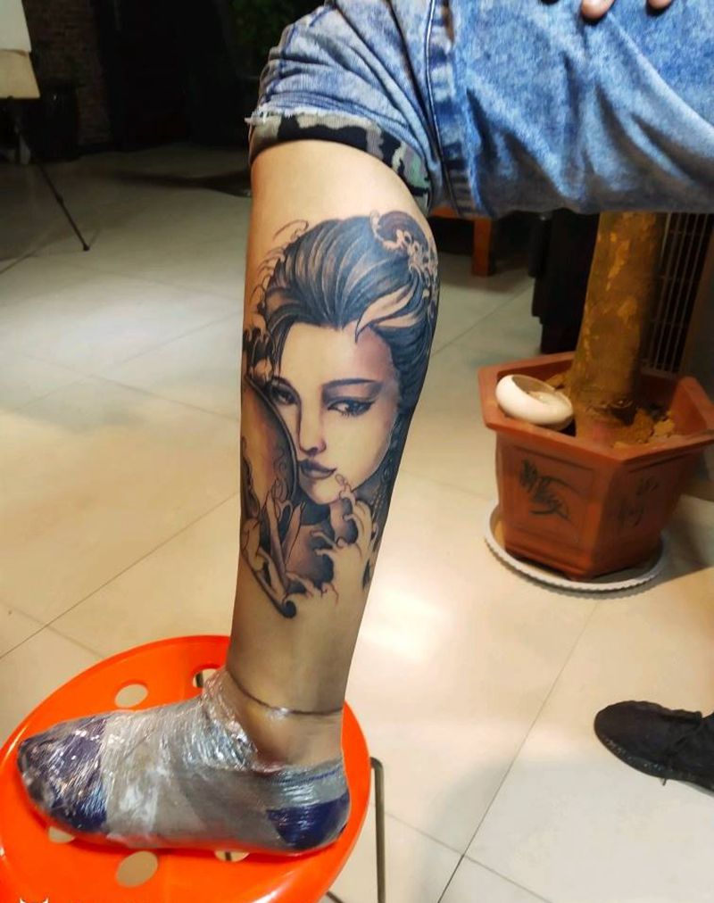 艺妓纹身图片_腿部新传统艺妓美女纹身图案