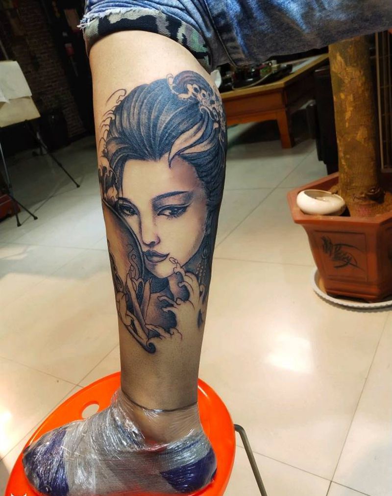 艺妓纹身图片_腿部新传统艺妓美女纹身图案