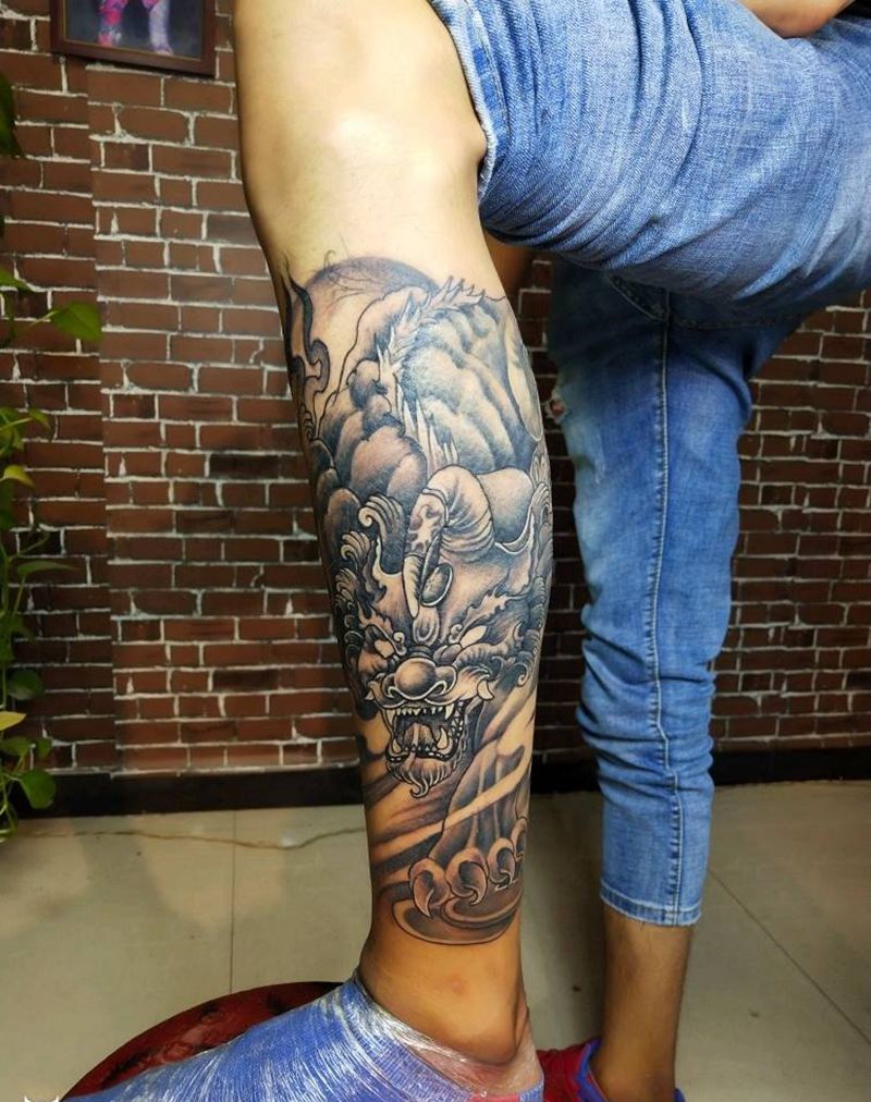 • T网红王老大花腿龙纹身图片_腿部新传统纹身图案