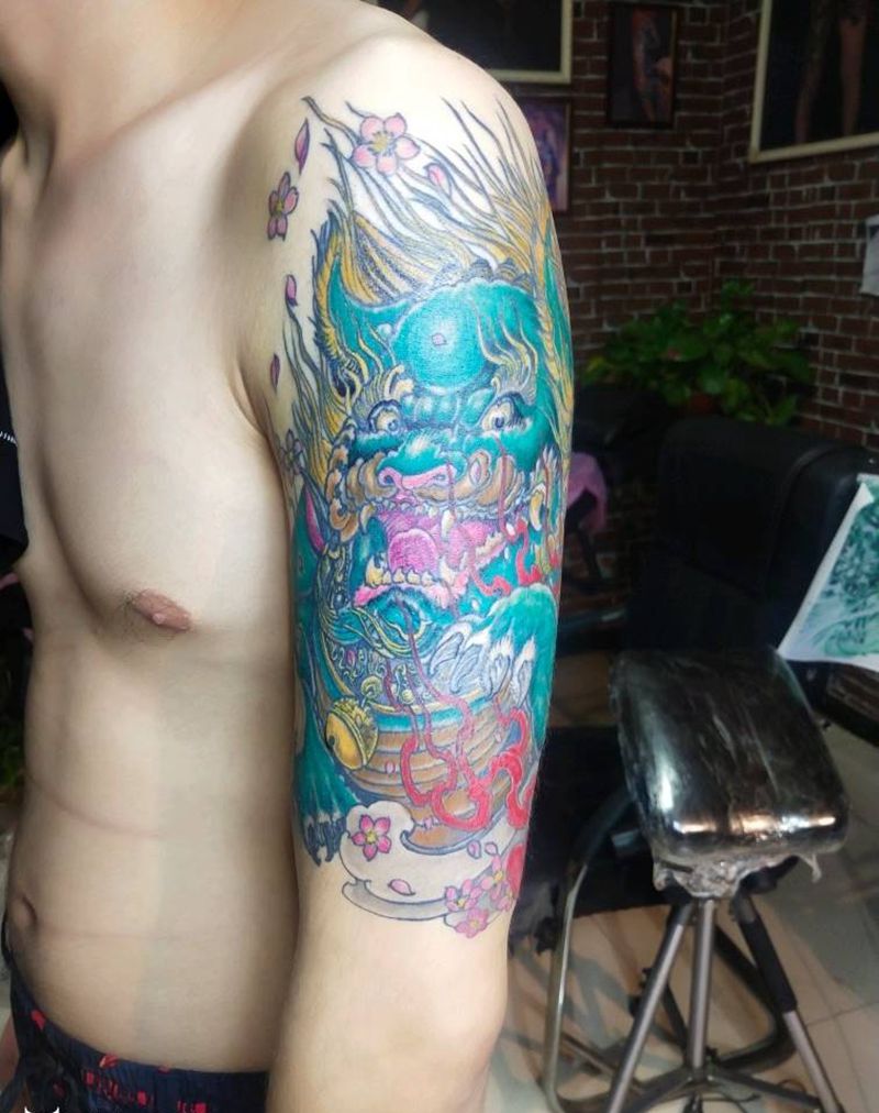 唐狮纹身图片_肩部新传统纹身图案