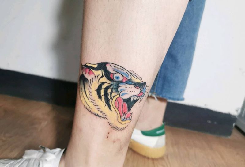 school虎头纹身图片_腿部Old School纹身图案