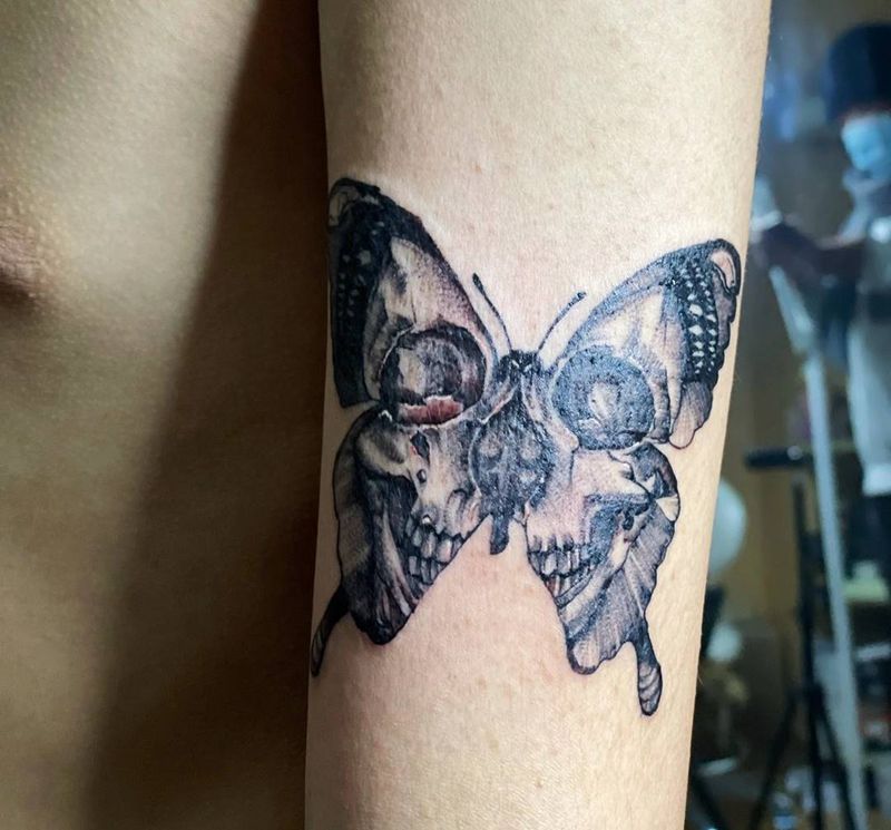 当前位置: 首页 >河北省保定市纹身店-楊·刺青工作室纹身图案>骷髅蝴蝶纹身图片_手臂纹身图案