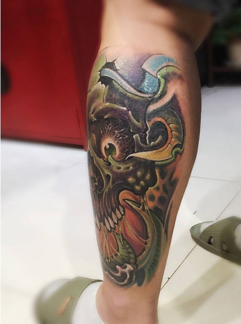 • T网红王老大花腿龙纹身图片_腿部新传统纹身图案
