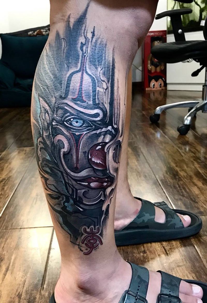 • T包小腿吹火男+阿多福纹身图片_腿部老传统新传统吹火男阿