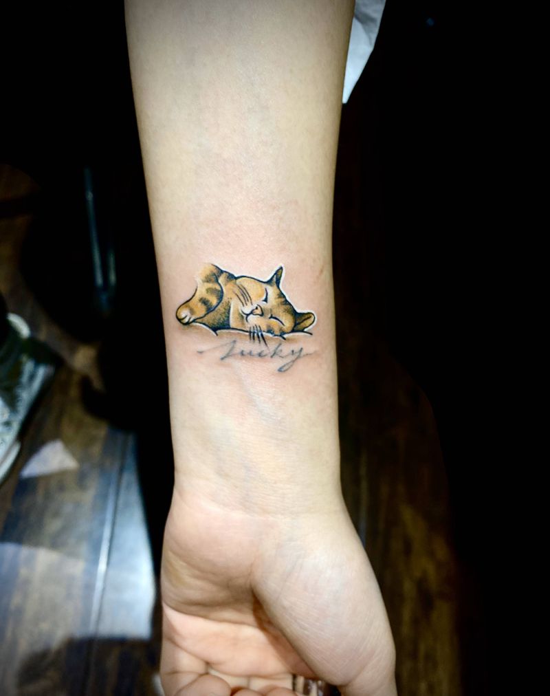 当前位置: 首页 >河北省邯郸市纹身店-邯郸牛刺青纹身图案>幸运的小猫纹身图片_手臂水彩纹身图案