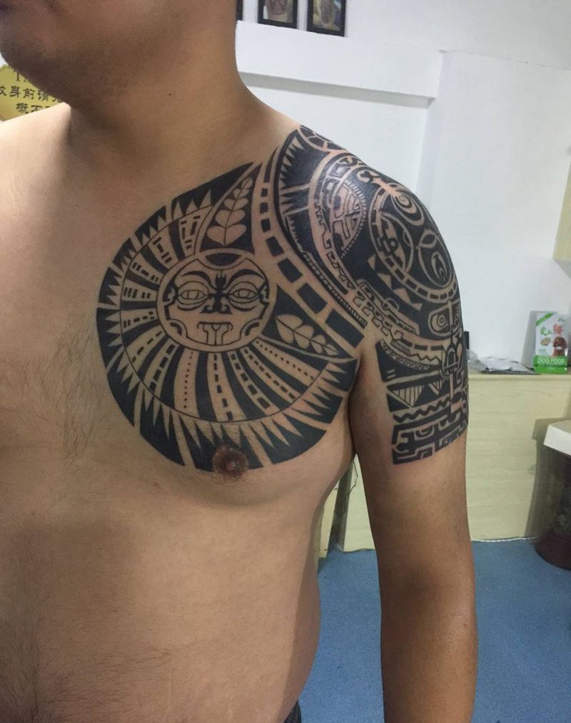 当前位置: 首页 >河北省保定市纹身店-王山刺青徐水店纹身图案>玛雅图腾半甲纹身图片