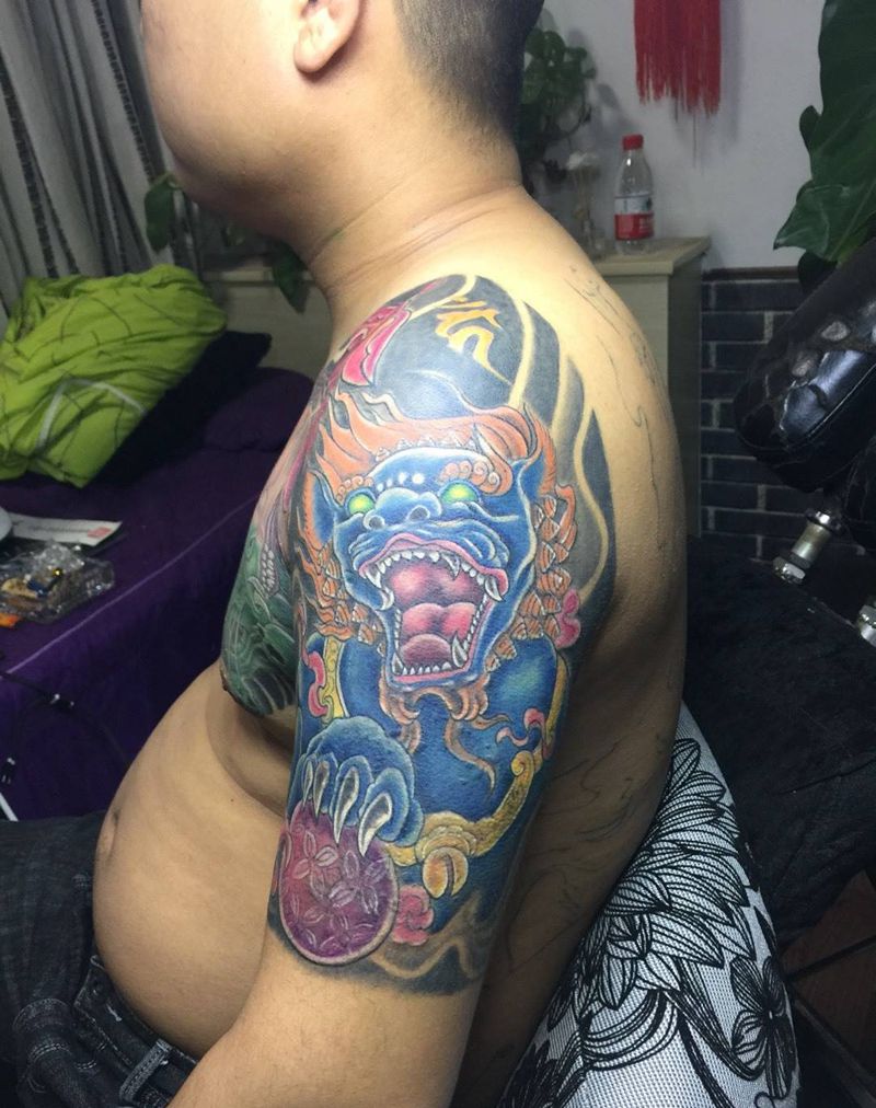 当前位置: 首页 >河北省保定市纹身店-王山刺青徐水店纹身图案>善恶加唐狮纹身图片