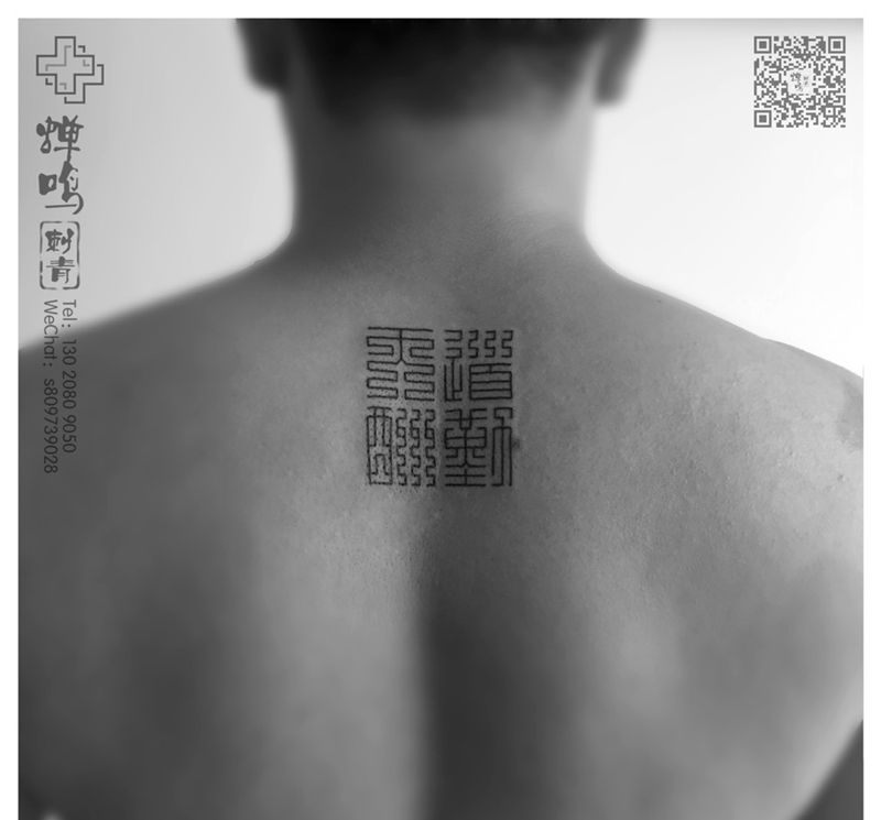 当前位置: 首页 >河北省保定市纹身店-蝉鸣刺青工作室纹身图案>篆书字体纹身图片_成品背部清新字符图腾纹身图案