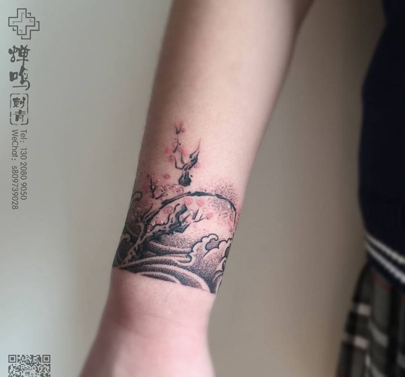 海浪梅花2.0纹身图片_成品手臂传统清新植物原创纹身图案