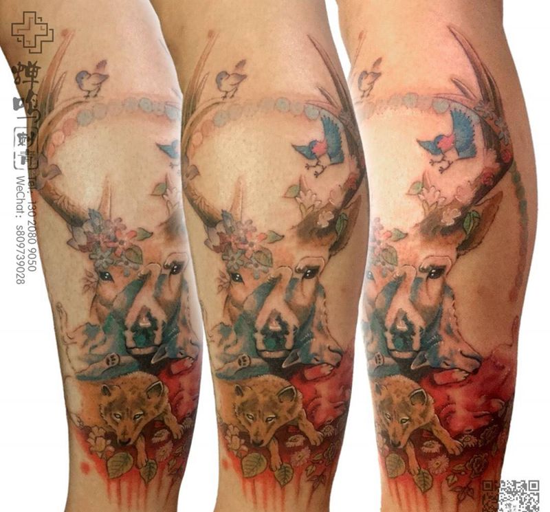 当前位置: 首页 >河北省保定市纹身店-蝉鸣刺青工作室纹身图案>鹿和狼纹身图片_成品腿部欧美清新动物植物纹身图案