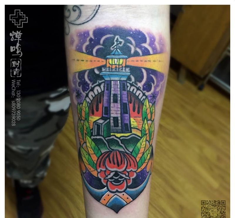 当前位置: 首页 >河北省保定市纹身店-蝉鸣刺青工作室纹身图案>灯塔纹身图片_成品手臂欧美静物植物纹身图案