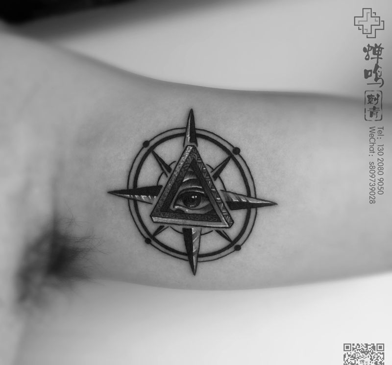 当前位置: 首页 >河北省保定市纹身店-蝉鸣刺青工作室纹身图案>全知之眼+指南针纹身图片_成品手臂清新静物原创纹身图案