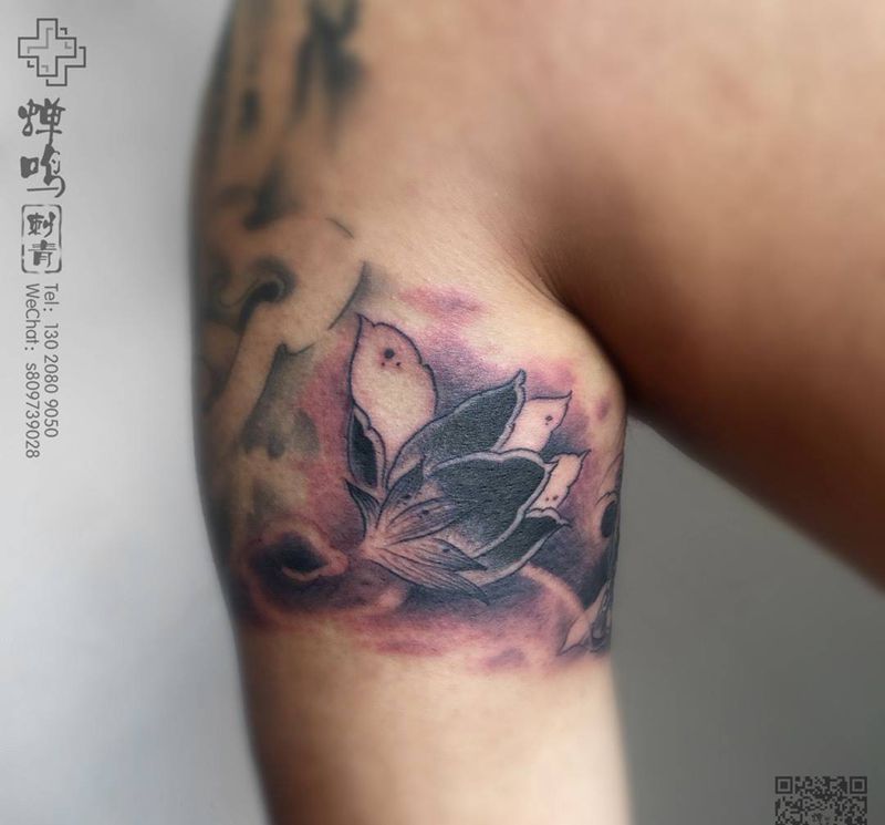 当前位置: 首页 >河北省保定市纹身店-蝉鸣刺青工作室纹身图案>荷花 如意纹身图片_成品手臂传统清新植物静物纹身图案