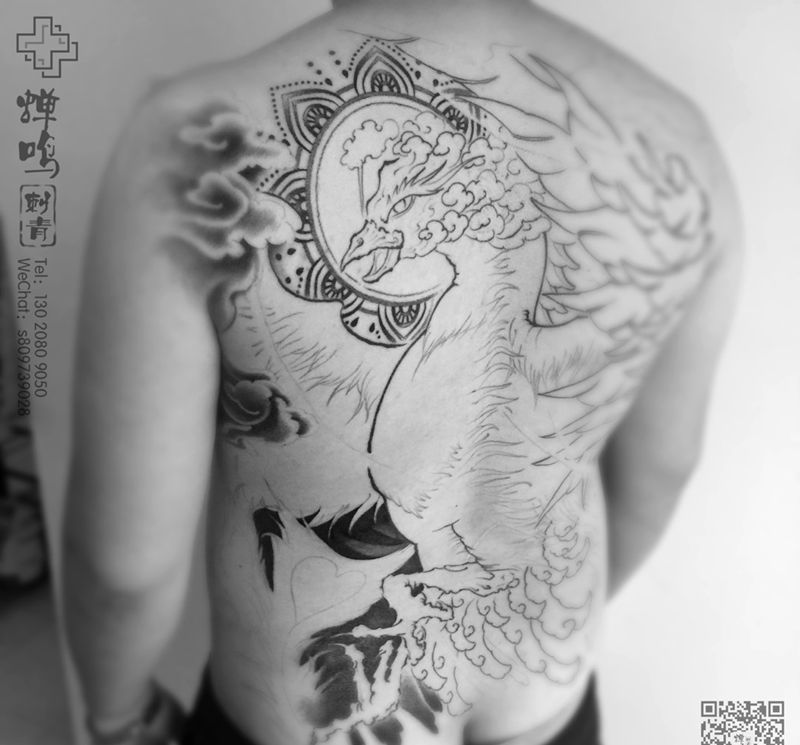 当前位置: 首页 >河北省保定市纹身店-蝉鸣刺青工作室纹身图案>凤凰纹身图片_成品背部传统原创纹身图案