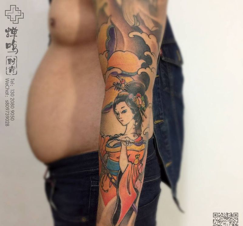 当前位置: 首页 >河北省保定市纹身店-蝉鸣刺青工作室纹身图案>艺妓、荷花纹身图片_成品手臂传统清新人物植物原创纹身图案