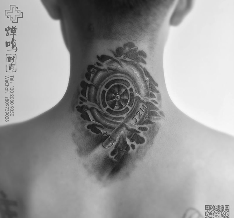 当前位置: 首页 >河北省保定市纹身店-蝉鸣刺青工作室纹身图案>涡轮纹身图片_成品颈部欧美写实静物纹身图案
