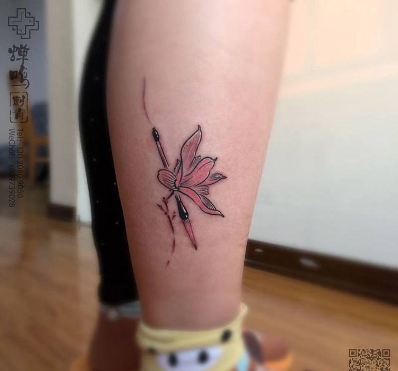 玉兰花与毛笔纹身图片_成品腿部清新植物静物原创纹身图案