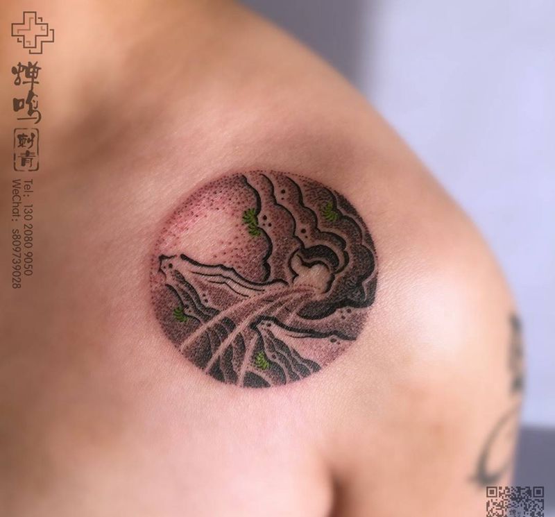 当前位置: 首页 >河北省保定市纹身店-蝉鸣刺青工作室纹身图案>海浪、怪石纹身图片_成品胸部传统清新植物静物图腾原创纹身图案