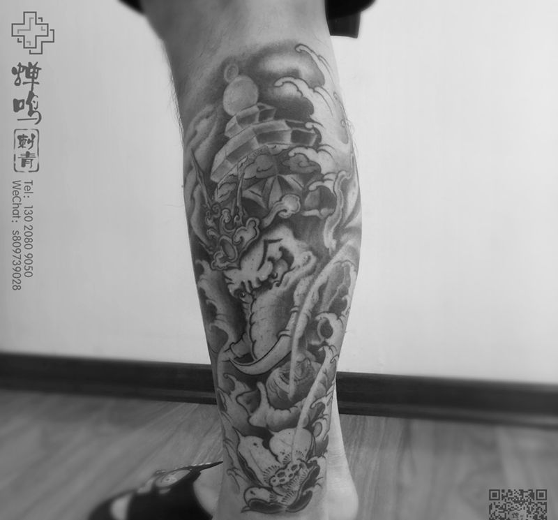 当前位置: 首页 >河北省保定市纹身店-蝉鸣刺青工作室纹身图案>象神纹身图片_成品腿部传统清新鬼神原创纹身图案