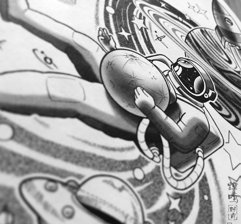 当前位置: 首页 >河北省保定市纹身店-蝉鸣刺青工作室纹身图案>遨游太空纹身图片_手臂腿部New School点刺纹身图案