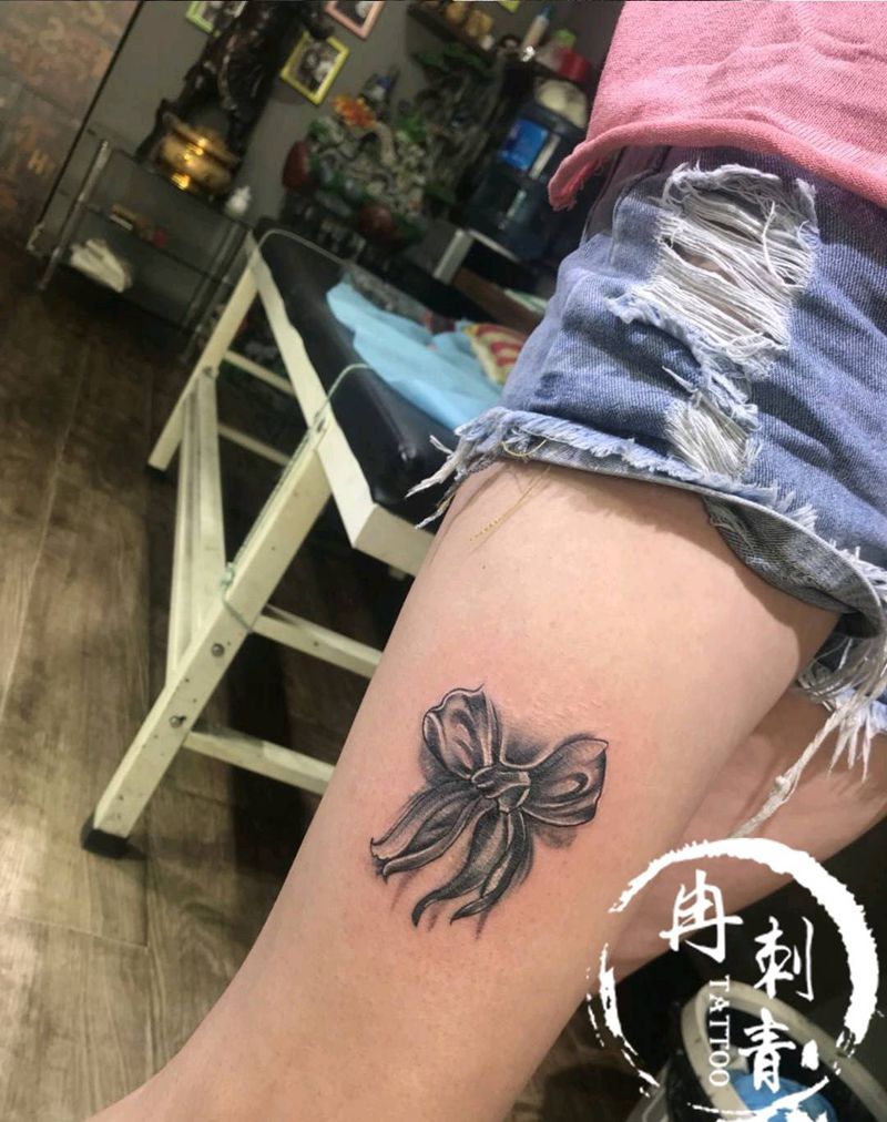 蝴蝶结纹身图片_腿部脚部新传统欧美写实3d纹身图案