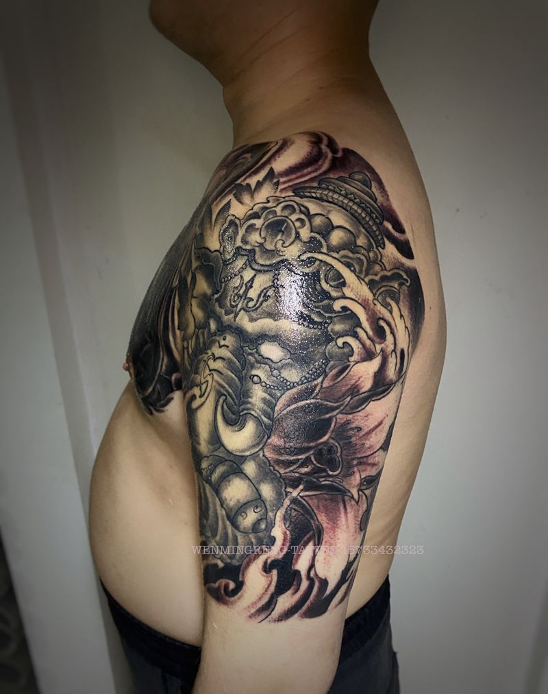 半甲佛头象神纹身图片_肩部胸部新传统纹身图案
