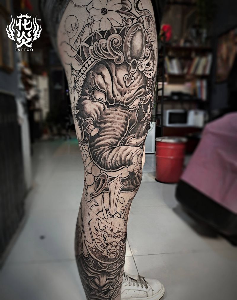 当前位置: 首页 >河北省保定市纹身店-花炎刺青纹身图案>象神花腿纹身图片_腿部新传统象神纹身图案