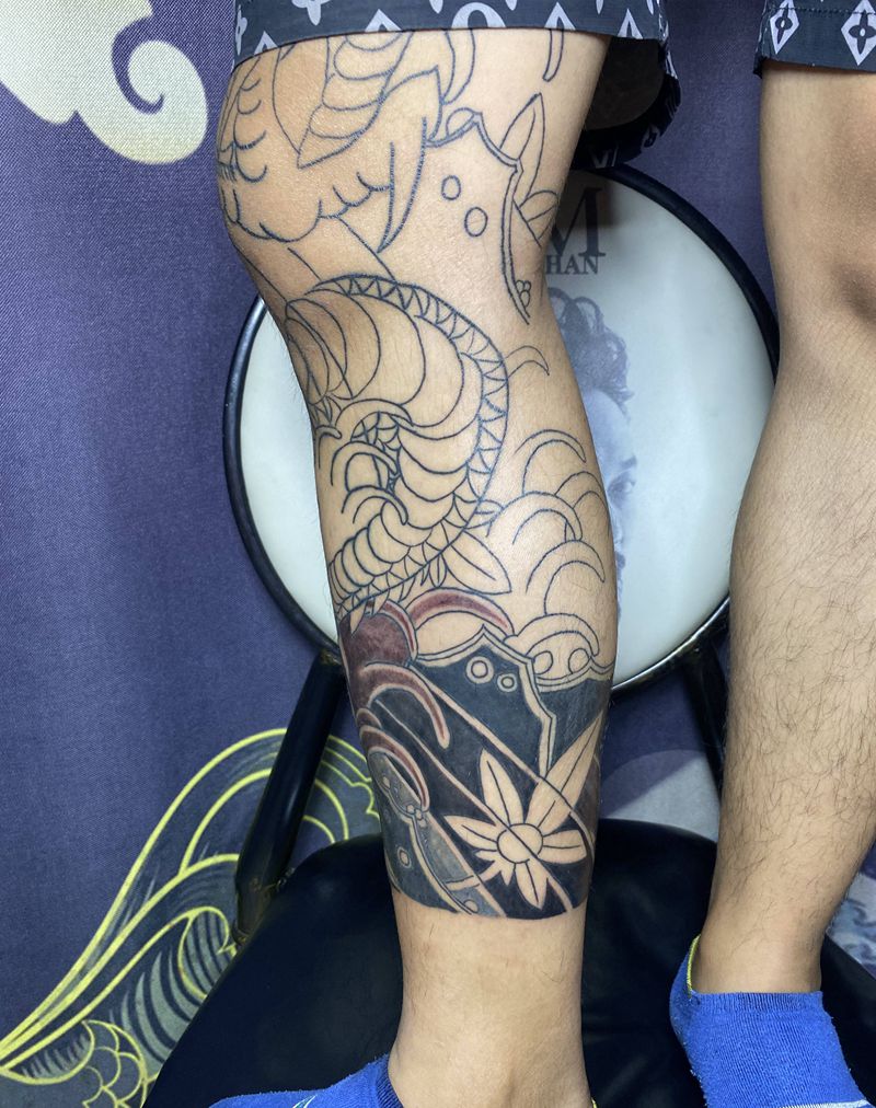 • T网红王老大花腿龙纹身图片_腿部新传统纹身图案