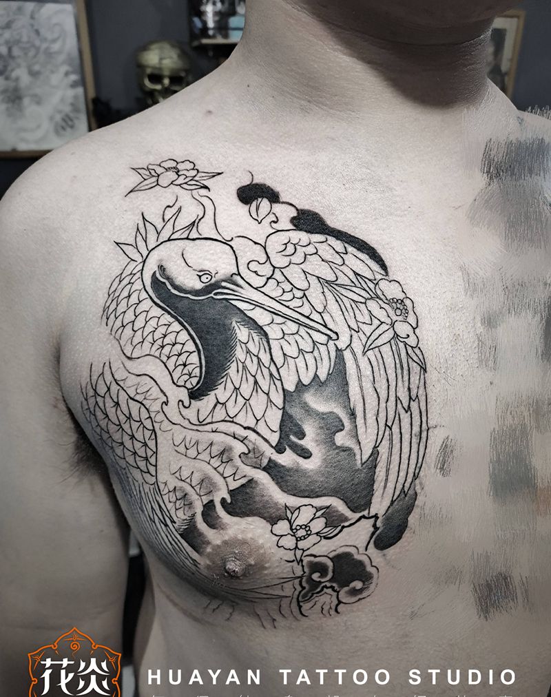 仙鹤半胛纹身图片_胸部新传统仙鹤纹身图案