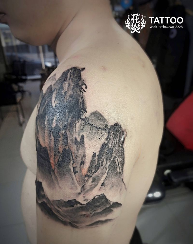 水墨山水纹身图片_肩部水墨山水纹身图案