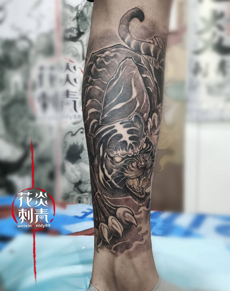 黑老虎纹身图片_腿部新传统老虎纹身图案