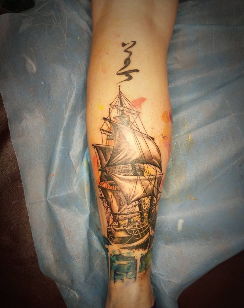 帆船纹身图片_腿部欧美写实帆船纹身图案