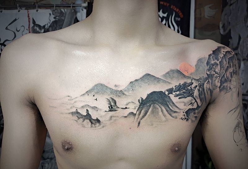 当前位置: 首页 >河北省保定市纹身店-花炎刺青纹身图案>山水纹身图片_胸部新传统山水纹身图案