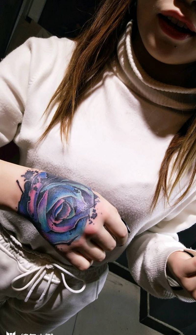 • 手背潮流时尚的玫瑰花眼睛纹身图案