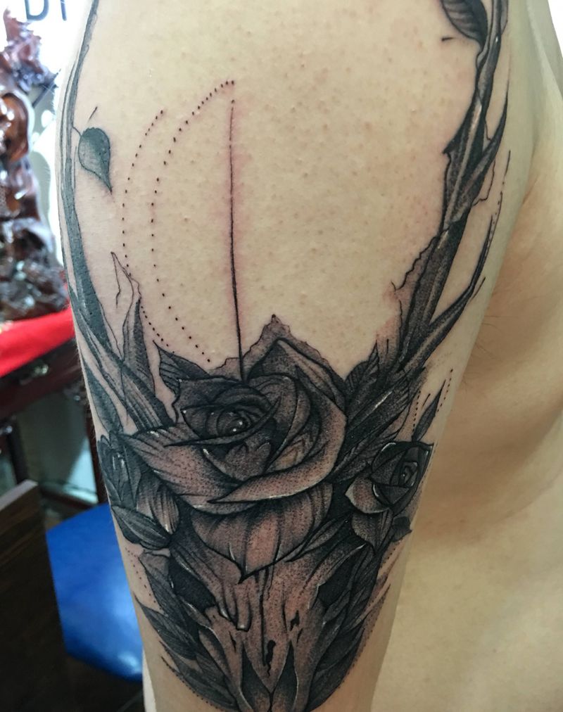 当前位置: 首页 >河北省邢台市纹身店-帝易刺青纹身图案>暗黑鹿头纹身图片_点刺纹身图案